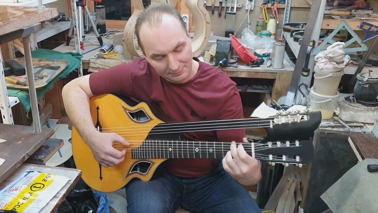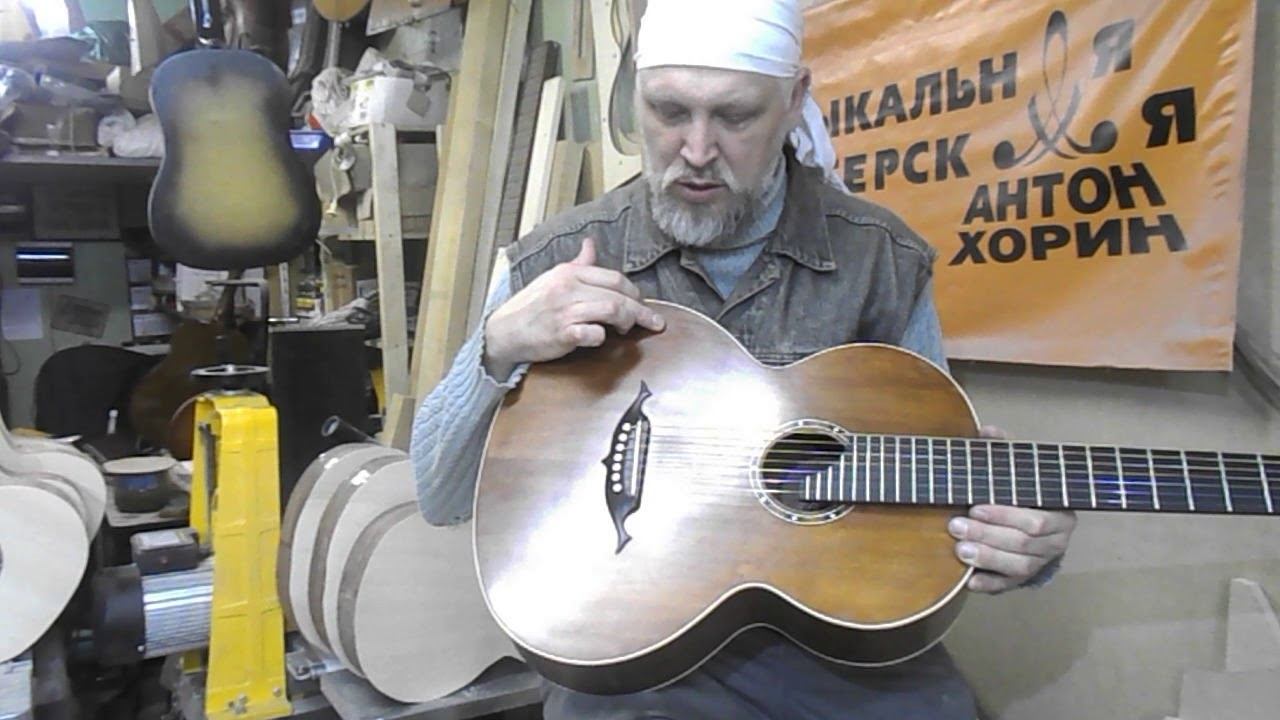 Музыкальный мастер Антон Юрьевич Хорин показывает новую гитару "Орехов" по модели австрийского мастера Шерцера, сделанную в мастерской "Антон Хорин".