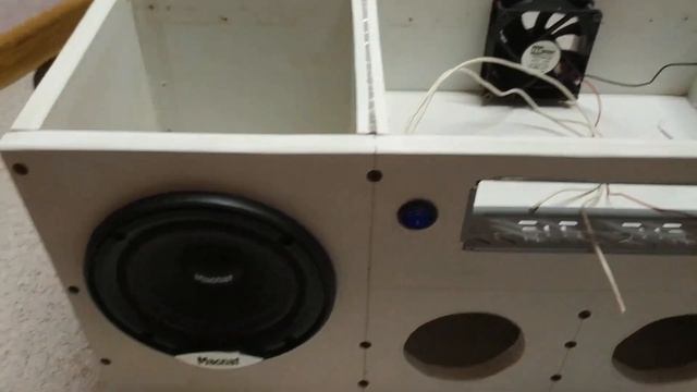 система состоит из 2 Закрытых ящиков 2 динамиков, магнитолы, блока питания типа ATX, звук громкий , в меру качественный,видео с шумами так как было темно.