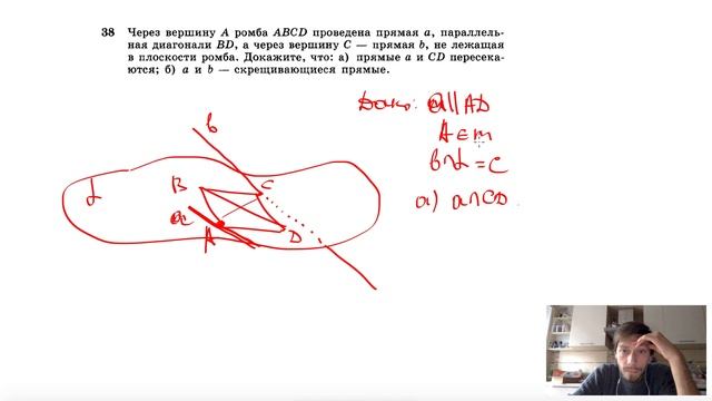 №38. Через вершину А ромба ABCD проведена прямая а, параллельная диагонали BD, а через вершину С — прямая b, не лежащая в плоскости ромба. Докажите, что: а) прямые а и CD пересекаются; б) а и b скрещивающиеся прямые.