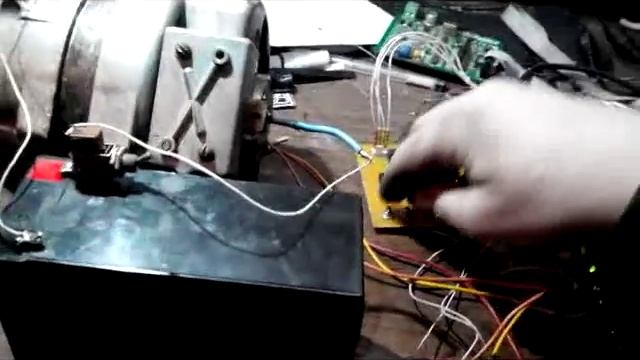 На обмотку ротора также подал +12 В от этого же автомобильного аккумулятора, но через токоограничивающий резистор 10 Ом 15Вт (ток около 1 Ампера). Второй конец обмотки ротора на минус. Минус платы мультивибратора также подкинул на минус аккумулятора. Нашел положение потенциометра для успешного запуска двигателя, а потом выкрутил потенциометр до максимальных оборотов двигателя
