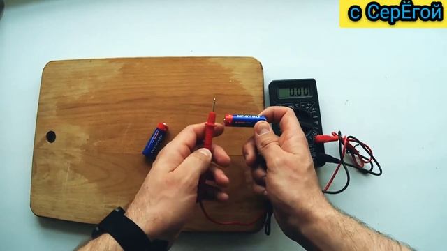 Показывается простой способ быстрой проверки пальчиковой батарейки с помощью мультиметра