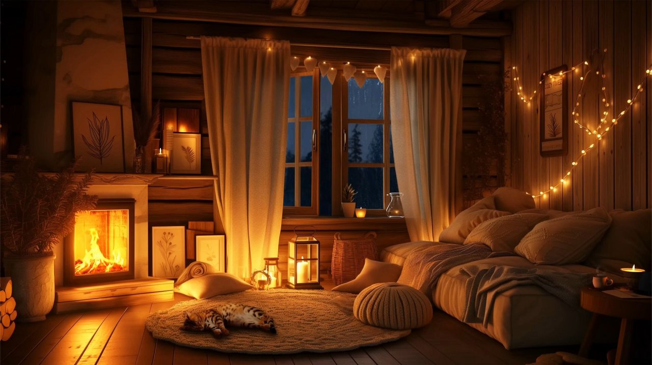 Мягкий снег падает крупными хлопьями, тёплые огни улиц и окон мягко мерцают, а огонь в камине создаёт ощущение уюта и покоя.