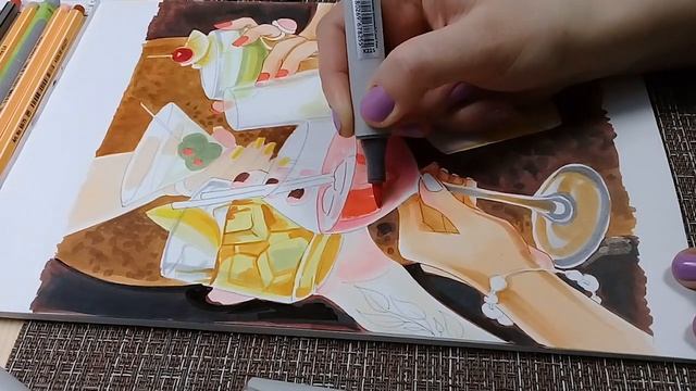 Как просто и узнаваемо изобразить фактуру стекла?! Как передать в рисунке особенности материала? В этом видео я объясняю, на что стоит обратить внимание при рисовании стеклянной посуды, и подробно рассматриваю, как изобразить разные жидкости в бокалах. На примере своей иллюстрации я показываю приемы рисования стекла маркерами для скетчинга .