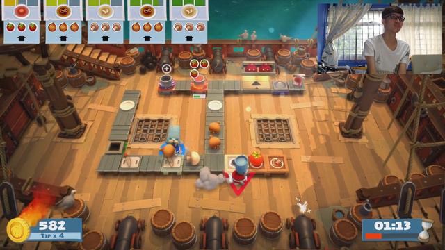 Overcooked is a chaotic couch co-op cooking game for one to four players. Working as a team, you and your fellow chefs must prepare, cook and serve up a variety of tasty orders before the baying customers storm out in a huff.