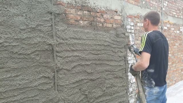Нанесение цементно-песчаной штукатурки, механизированным способом. Материал куплен в Альтус.ру смотреть онлайн