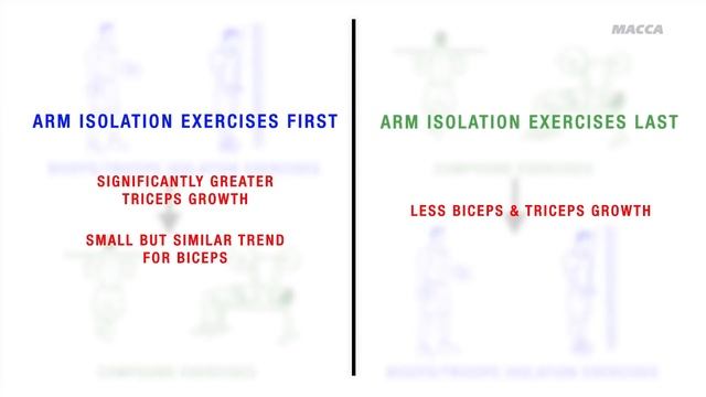 Например, в статье 2010 года, из журнала Исследования силы и кондиций, сравнивали эффективность выполнения в тренировке базовых упражнений перед изолирующими на руки с выполнением изолирующих упражнений перед базовыми. Через 12 недель они обнаружили значительно больший рост трицепса, когда изолирующие упражнения на руки выполнялись в начале. И аналогичная тенденция была обнаружена и для бицепса. Этот эксперимент был также воспроизведен в другом исследовании, которое привело исследователей к заключению, что если упражнение важно для достижения индивидуальных тренировочных целей, то оно должно быть выполнено в начале тренировки. Вне зависимости от того, на большую группу мышц это упражнение или на малую.