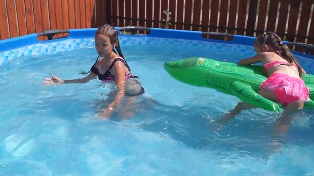 We spend family leisure time in the pool with children.