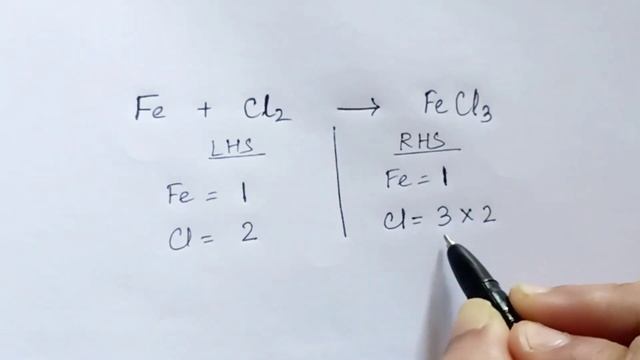How to Balance the equation FeCl2+Cl2=FeCl3 count the number atoms of each element on both the side of arrow in the chemical equation and write in table.