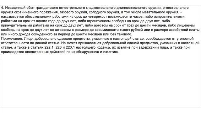 Незаконные приобретение, передача, сбыт, хранение, перевозка или ношение оружия, а также его основных частей и боеприпасов предусмотрено статьей 222 уголовного кодекса.