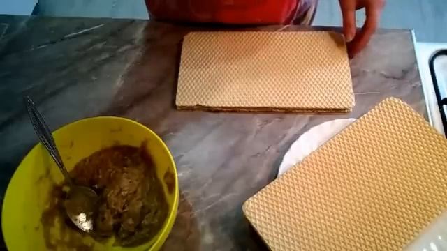 а разделочную доску кладем вафельный корж и выкладываем 3-4 ложки фарша. фарш распределяем по всей поверхности коржа. Сверху накрываем вторым коржем и оставляем на 10 минут.Для того чтобы корж пропитался и стал мягким.