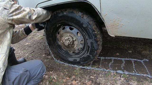 Самый простой способ надеть цепи противоскольжения на колеса передней оси а/м.