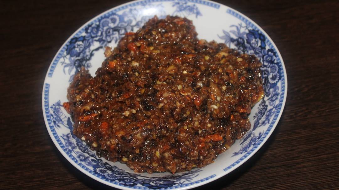 1. Prepared dried milled through a meat grinder or food processor, add chopped nuts.