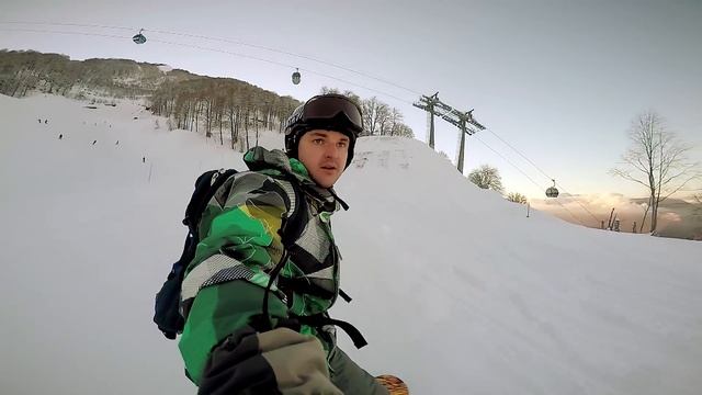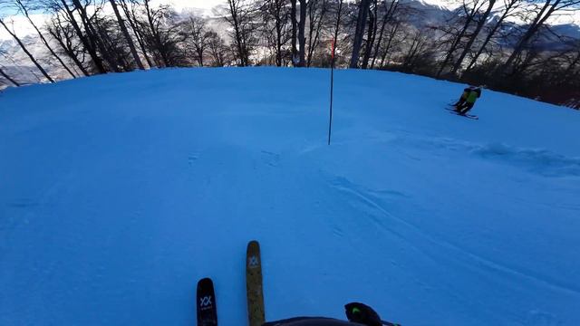 Спуск по трассе Тритон почти с Розы Пик (стартовал с верхней станции подъемника Эдельвейс, поэтому нет первых 200 метров) по дороге небольшой кусок по Змейке (идет параллельно Тритону и соединяется с ним). На 1600 свернул на Б-52, и в конце чуть зацепил трассу Роза Блейд