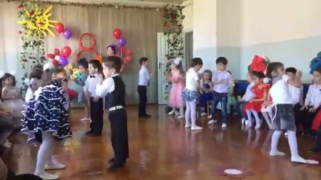 Видео показывает танцевальное выступление старшей группы детского сада на празднование 8 марта. Дети исполняют общий парный танец, посвященный мамам.