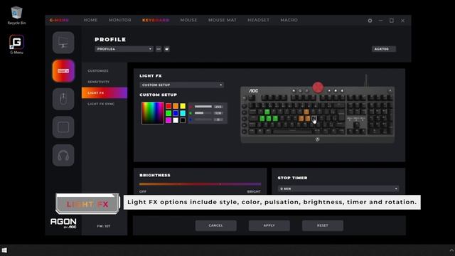 - Light FX: If your monitor supports light effects, they can now be controlled with keyboard and mouse through AOC G-Menu.
