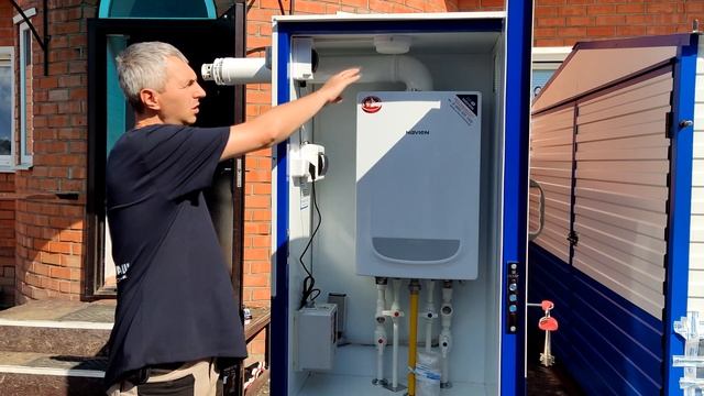 Котел смонтирован в утепленном металлическом боксе с двускатной крышей, передняя и задняя панели выполнены открывающимися для удобства обслуживания.
