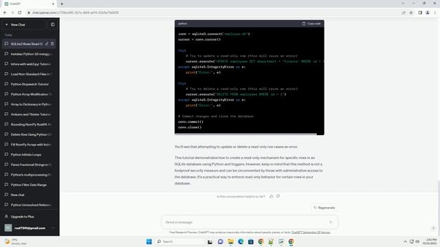 This tutorial demonstrates how to create a read-only mechanism for specific rows in an SQLite database using Python and triggers. However, keep in mind that this method is not a foolproof security measure and can be circumvented by those with administrative access to the database. It's a practical way to enforce read-only behavior for certain rows in your database.