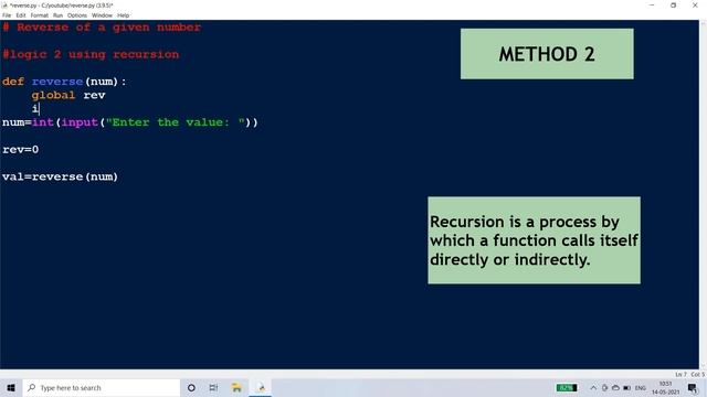 In this python program we will use while loop, functions and subscript operator to find the reverse of the given number. We will be discussing more than two logics in this python video tutorial.