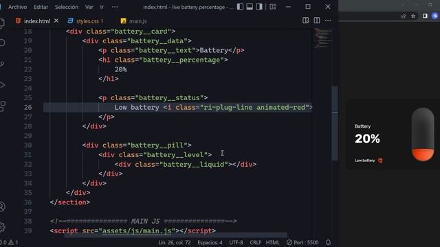 How to make a real time battery level indicator using HTML CSS and JavaScript. With animation of low battery, charging battery and full battery and beautiful colors according to the percentage of the battery.
