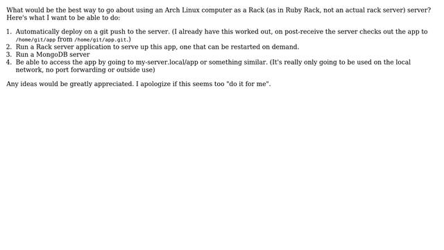DevOps & SysAdmins: Using Arch Linux computer as a server for Rack Apps