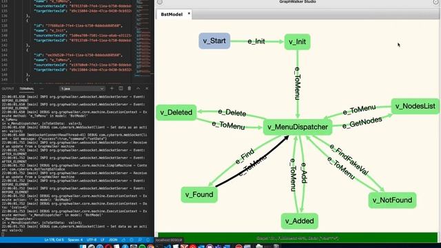 Model Based Testing of Binary Search Tree using GraphWalker running as a WebSocket server. The test itself as a WebSocket client
