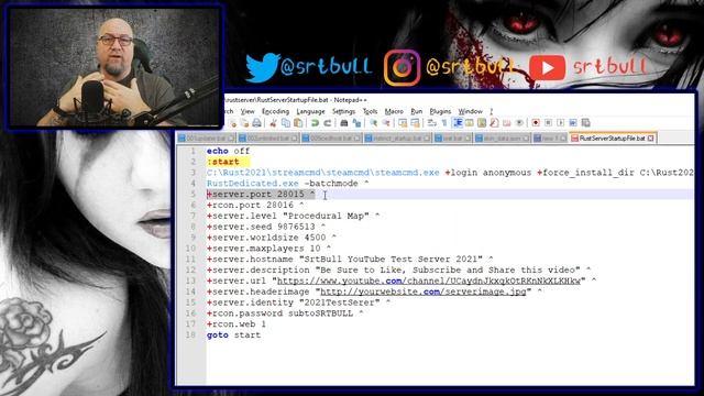 RustDedicated.exe -batchmode +server.port 28015 +rcon.port 28016 +server.level "Procedural Map" +server.seed 9876513 +server.worldsize 4500 +server.maxplayers 10 +server.hostname "SrtBull YouTube Test Server 2021" +server.description "Be Sure to Like, Subscribe and Share this video" +server.url "https://www.youtube.com/channel/UCaydnJkxqkOtRKnNkXLKHkw" +server.headerimage "http://yourwebsite.com/serverimage.jpg" +server.identity "2021TestSerer" +rcon.password subtoSRTBULL +rcon.web 1