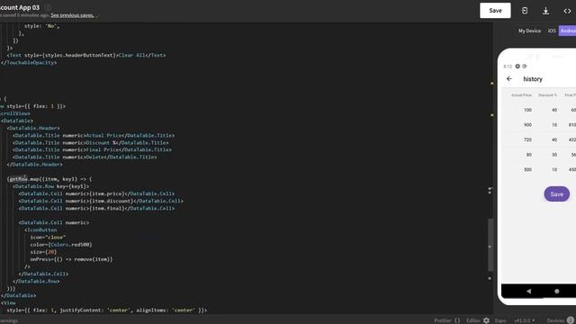 A discount app is created with two screens and are navigated using react navigation. A history is maintained and has deletion functionality.