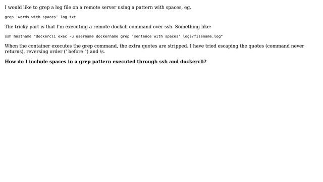 How do I include spaces in a grep pattern executed through ssh and dockercli? смотреть онлайн