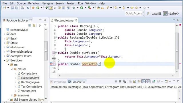 Enoncé : 1 – Créer une classe Java nommée Rectangle ayant pour attributs : Longueur et Largeur tous deux du type Double, ajouter ensuite un constructeur avec paramètres.