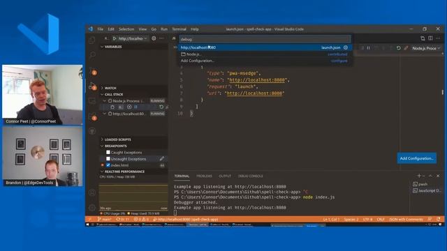 Join Connor and Brandon as they develop and debug a webpage with VS Code. You'll learn how to use the JavaScript debugger to fix functional and performance issues in your site, and learn about the new integration with Microsoft Edge DevTools to provide DOM and network debugging right alongside your source code.