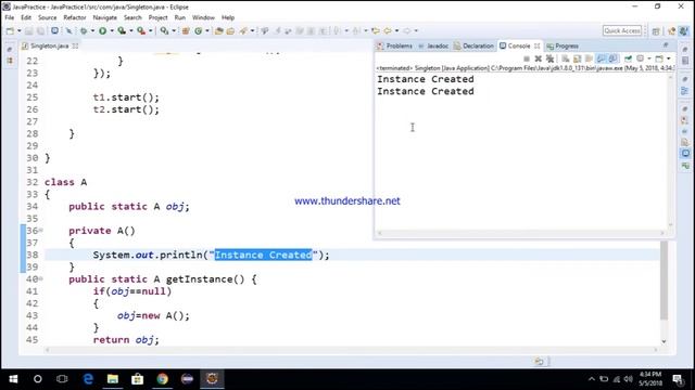 A thread-safe singleton class is to make the global access method synchronized. Using this concept, a single thread can execute this method at a time. If you want huge amount of work to be done using getInstance method then it will decreased your system performance by factor of 100. To solve this problem we can use "double checked locking".