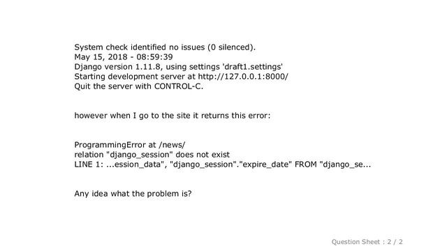 #Django:ProgrammingError:relationdjangosessiondoesnotexist #Django #: #ProgrammingError: #relation #"django_session" #does #not #exist
