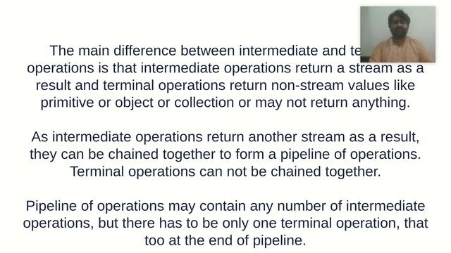 The main difference between intermediate and terminal operations is that intermediate operations return a stream as a result and terminal operations return non-stream values like primitive or object or collection or may not return anything.