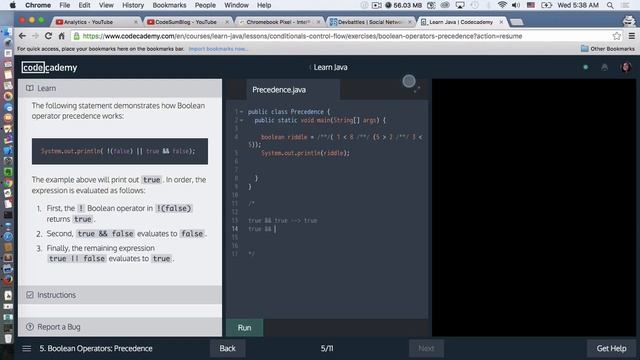 Codecademy Java walkthrough boolean operator precedence. Learn what returns true versus false.