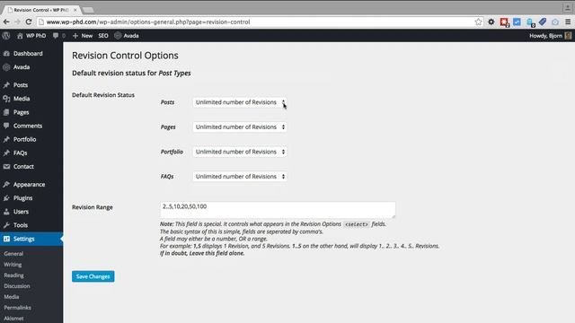 You may see more or less post types than I have in this example because the plugin can limit revisions for custom post types.
