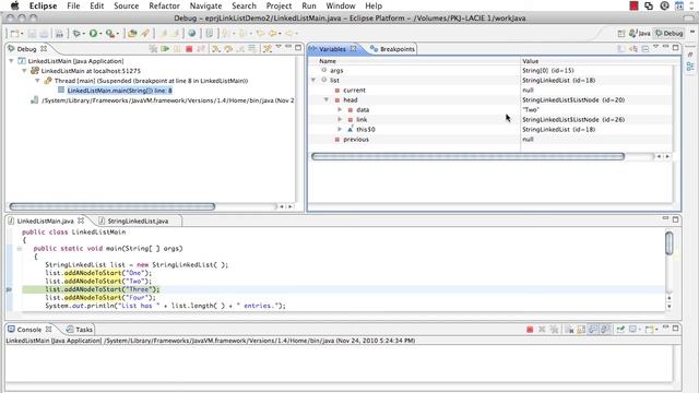 An in-class presentation using Eclipse to step through a program using linked lists. See how the lists are built from a node at a time and how they link together.