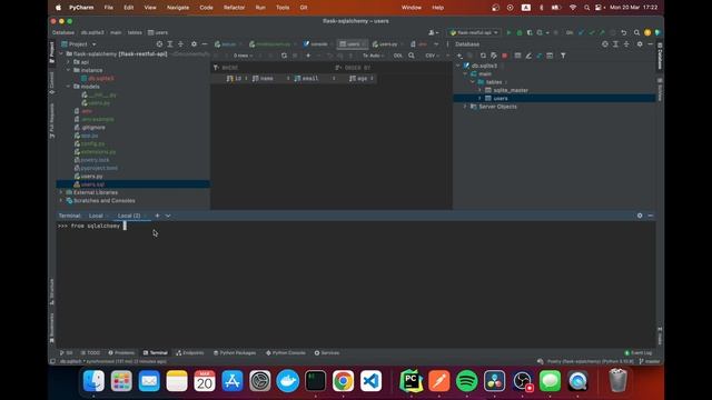 In this video we will update our restful API and start using the SQLAlchemy ORM by introducing flask-sqlalchemy. flask-sqlalchemy is a Flask extension that uses the SQLAlchemy ORM and helps us work with our database. We will fetch all of our users from our database, fetch a single user, update a user, create a user as well as delete a user.