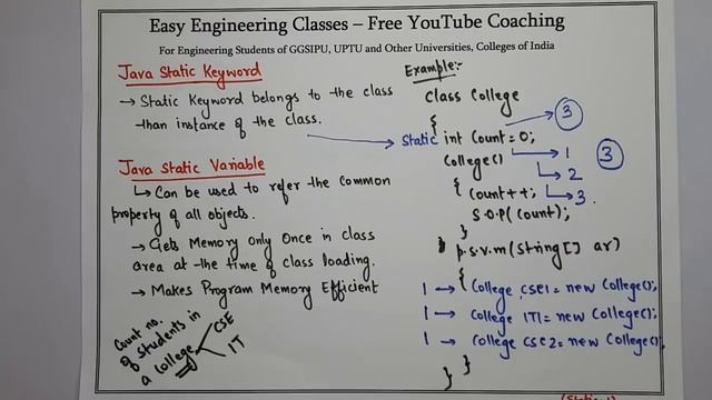 In this video you can learn about Java Static Keyword in Java Programming Course. Following topics of Java Programming Course are discussed in this lecture: Java Static Keyword: Static Variable, Static Method, Static Block, Restrictions of Static Method. This topic is very important for College University Semester Exams, Placement Exam Preparation, Placement Interview Preparation and Other Competitive exams like NTA NET, NIELIT, DSSSB tgt/ pgt computer science, KVS CSE, PSUs etc.