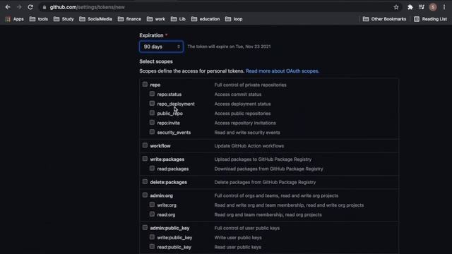 Detailed Info links: https://docs.github.com/en/github/authenticating-to-github/keeping-your-account-and-data-secure/creating-a-personal-access-token