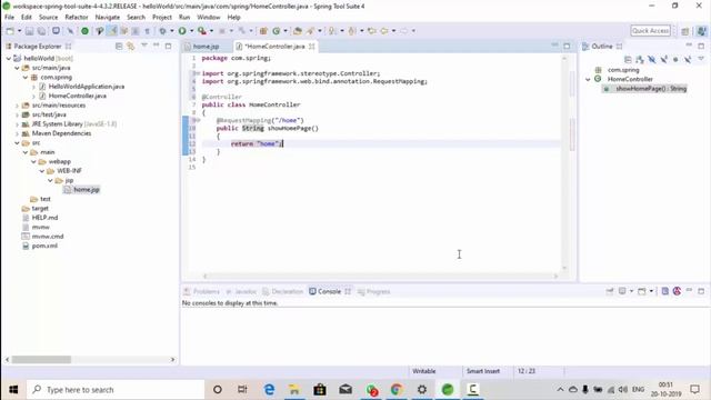 In this example we have created a very simple Hello World web project using Spring Boot in STS. A controller class is created that handles a /hello request and forwards to a jsp page.