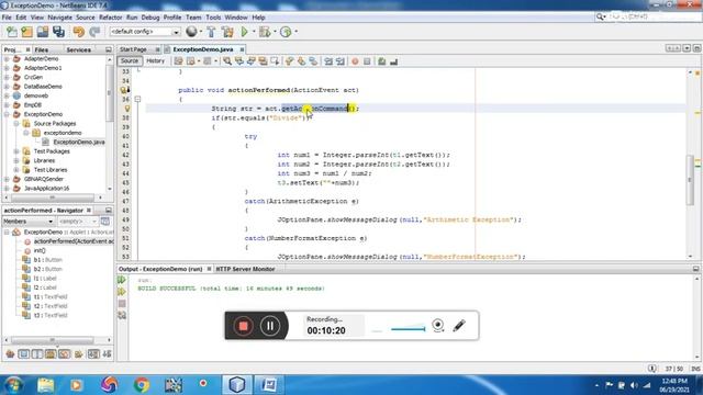 Write a program that creates a user interface to perform integer divisions. The user enters two numbers in the textfields, Num1 and Num2. The division of Num1 and Num2 is displayed in the Result field when the Divide button is clicked. If Num1 or Num2 were not an integer, the program would throw a NumberFormatException. If Num2 were Zero, the program would throw an Arithmetic Exception Display the exception in a message dialog box.