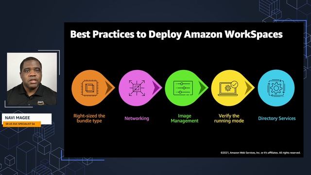Designed for IT Decision Makers and Administrators looking to launch an Amazon WorkSpaces deployment, Navi Magee, Sr. Solutions Architect for End User Computing will provide a step-by-step walk-through of how to get up and running quickly and scalably. Topics covered will include: Advantages of using Amazon WorkSpaces (DaaS), BYOD, Amazon WorkSpaces Features, and Best Practices to Deploy an Amazon WorkSpaces environment.