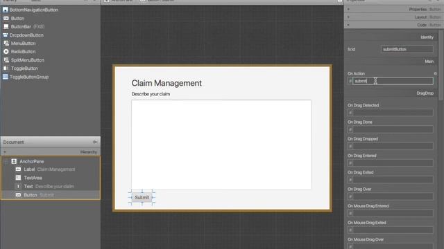 Once the UI is done and behaves as expected on window resize, it’s time to bind it to the Java application. For this, each UI control is identified by an id (fx:id), and the events or actions are bound to a method name. Once this is done, the generated controller skeleton can be used as a starting point to implement the Java controller, using the JavaFX APIs.
