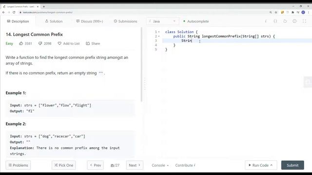 In the end, you’ll have a really good understanding on how to solve Leetcode 14. Longest Common Prefix and questions that are similar to String.