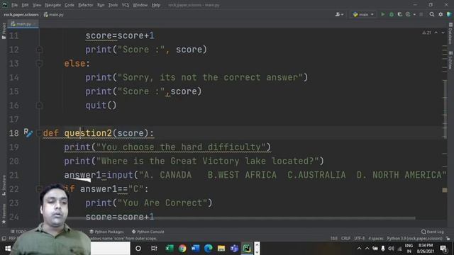 This is a very simple text-based game in python. It a small quiz which you can make for yourself as well or your friends. We do not need to import any modules for this game which makes it easier! Try it yourself.