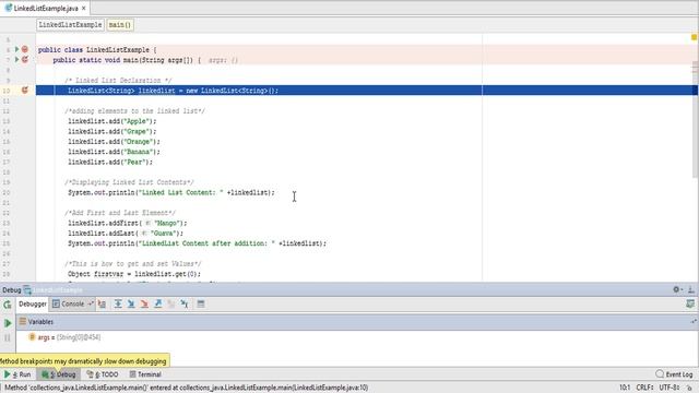 Understanding Java Linked List in java Tutorial with the help of debug by which the flow of fast code output is broken in an understandable slow understanding way.