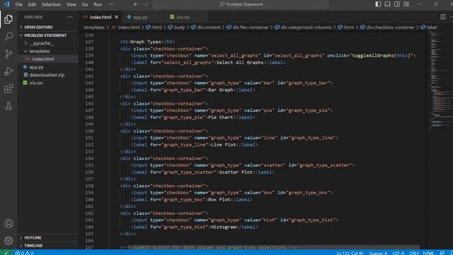 The project is a data visualization web application built using Python's Flask framework. It allows users to visualize data from a CSV file through various types of graphs and charts. The application loads the data into a Pandas DataFrame and categorizes the columns as unique or non-unique. The user interface enables users to select specific columns and graph types for visualization. Upon submission, the Flask app generates the selected graphs using matplotlib, converts them into base64-encoded images, and displays them on the web page. The application provides an interactive and user-friendly way to explore and analyze data visually without requiring users to write any code.