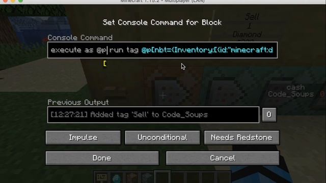 orange command block 1. execute as @p run tag @p[nbt={Inventory:[{id:"minecraft:diamond"}]}] add Sell