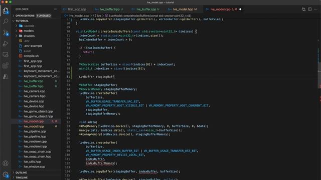 In this tutorial we create a buffer abstraction to make working with buffers a bit more convenient. We replace existing usages (vertex and index buffers) with this new abstraction, and then create a uniform buffer object which will store read-only data that can be updated dynamically between frames, to pass additional data to our shaders.