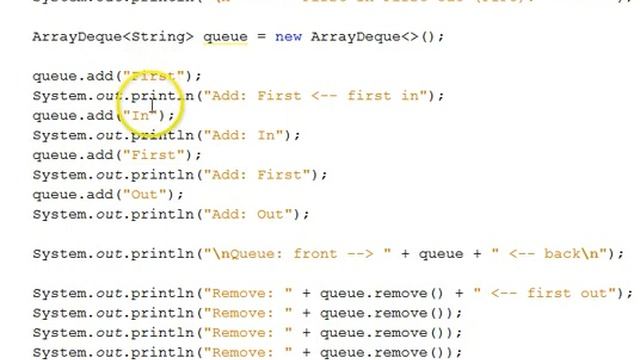 Demonstrates the queue data structure via the ArrayDeque class.